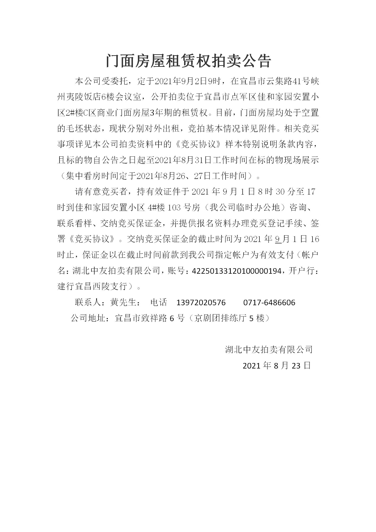 佳和家園安置小區(qū)2#樓C區(qū)商業(yè)門面房屋租賃權(quán)拍賣公告
