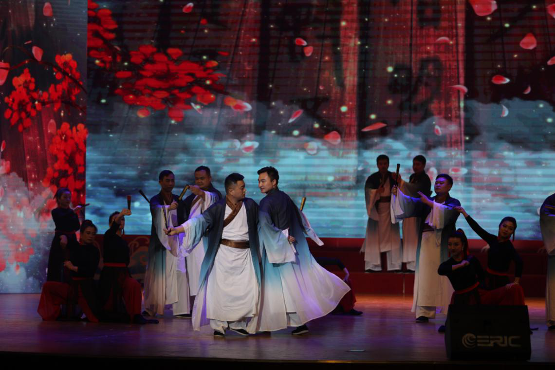 隨著音樂響起,“楚國男子”白衣飄飄,手持紙扇,“江南女子”搖曳身姿,執(zhí)扇起舞。公司參加表演的職工在舞臺上大放異彩,為現(xiàn)場和觀看直播的觀眾奉上一場美輪美奐的文化盛宴,既再現(xiàn)了楚國藝術(shù)的奇異想象和浪漫色彩,也展現(xiàn)了江南點軍的神秘風(fēng)情和深遠文化。