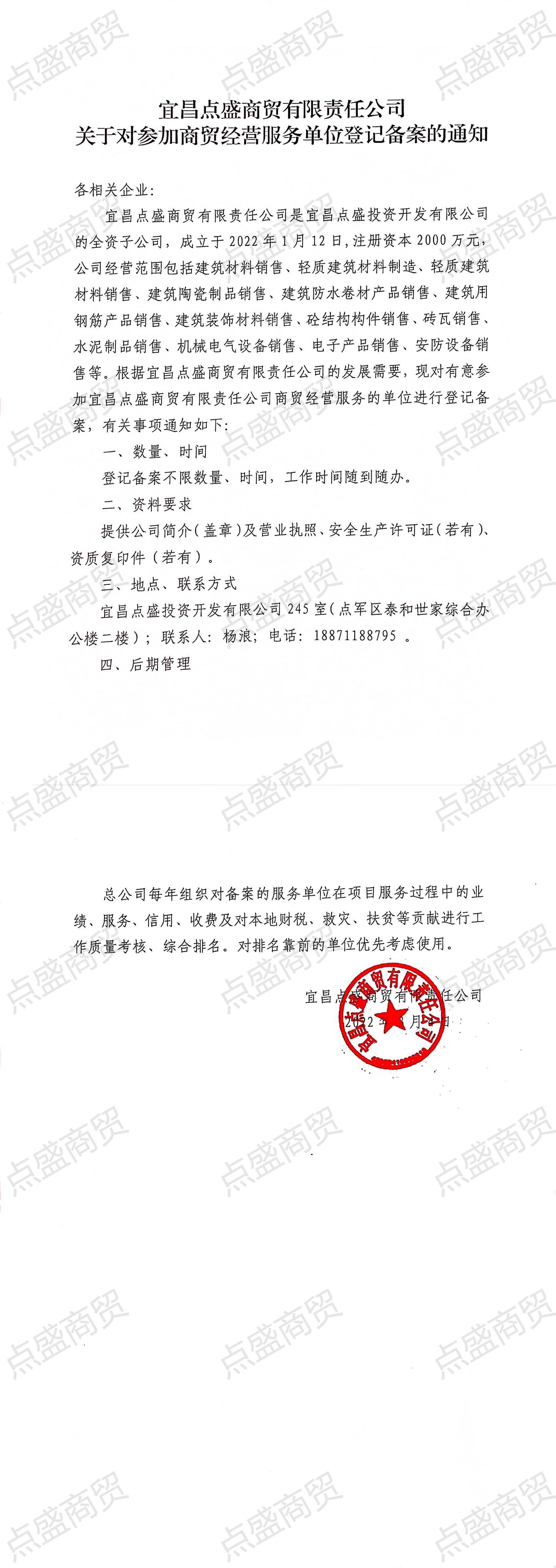 宜昌點(diǎn)盛商貿(mào)有限責(zé)任公司關(guān)于對參加商貿(mào)經(jīng)營服務(wù)單位登記備案的通知