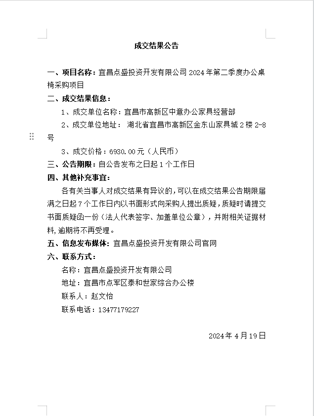 宜昌點(diǎn)盛投資開(kāi)發(fā)有限公司2024年第二季度辦公桌椅采購(gòu)項(xiàng)目成交公告