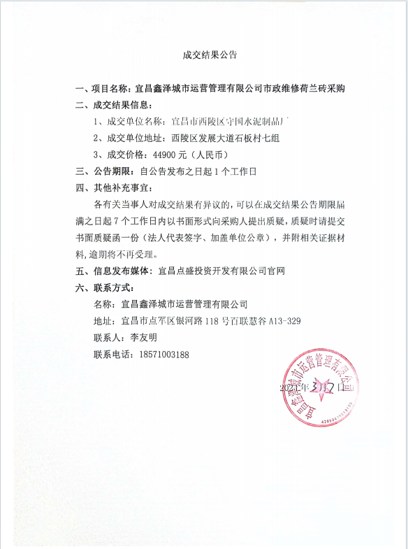 宜昌鑫澤城市運(yùn)營管理有限公司市政維修荷蘭磚采購項(xiàng)目成交公告