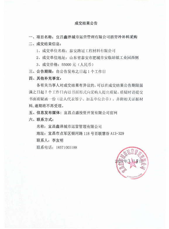宜昌鑫澤城市運(yùn)營管理有限公司瀝青冷補(bǔ)料采購項目成交公告