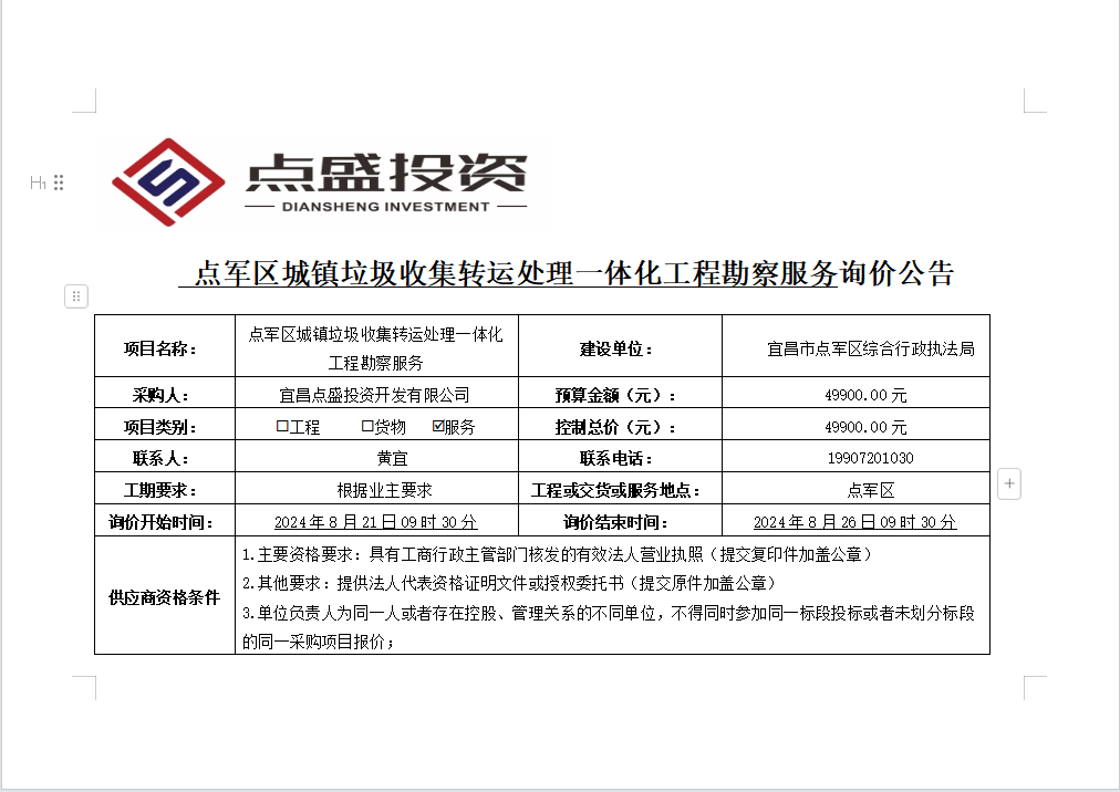 點軍區(qū)城鎮(zhèn)垃圾收集轉(zhuǎn)運處理一體化工程勘察服務(wù)詢價公告