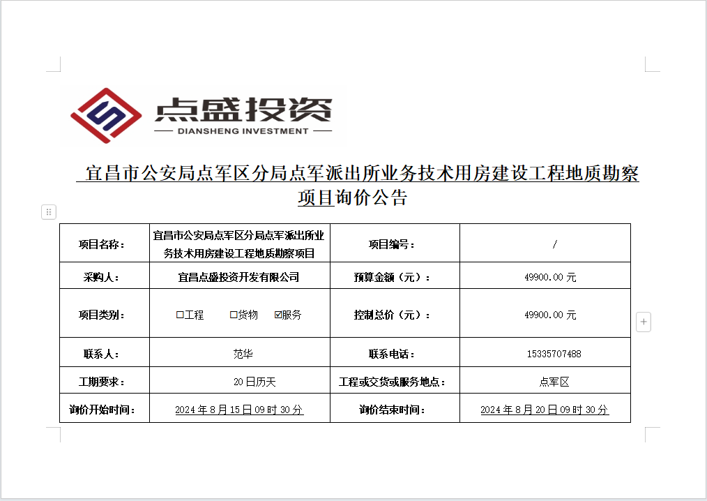 宜昌市公安局點(diǎn)軍區(qū)分局點(diǎn)軍派出所業(yè)務(wù)技術(shù)用房建設(shè)工程地質(zhì)勘察項(xiàng)目詢(xún)價(jià)公告