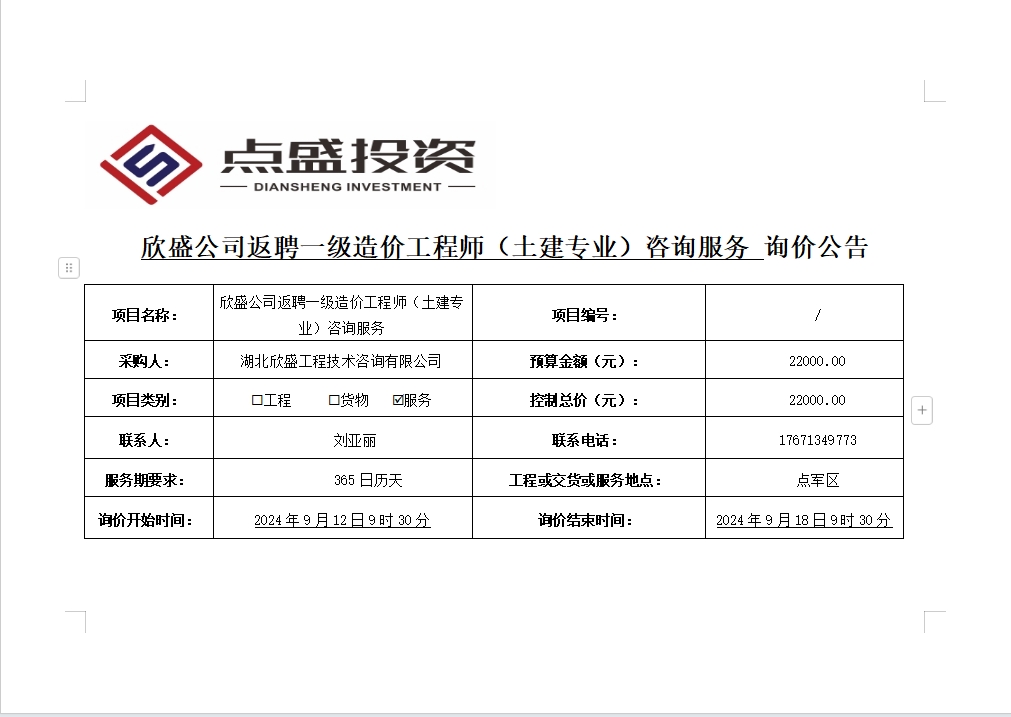 欣盛公司返聘一級(jí)造價(jià)工程師(土建專(zhuān)業(yè))咨詢(xún)服務(wù)詢(xún)價(jià)公告